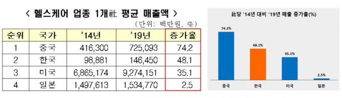 특히 한국 헬스케어 기업은 총매출액이 같은 기간 70.1% 증가했고, 매출액이 1조 원을 넘어서는 기업도 2014년 2곳에서 2019년 10곳으로 4배 증가했다.