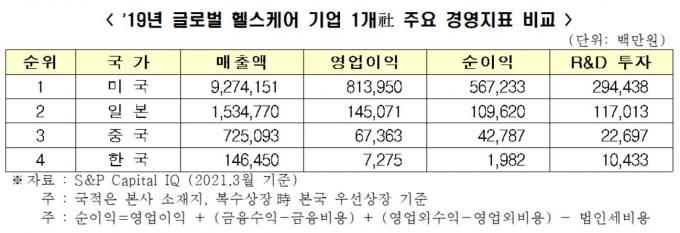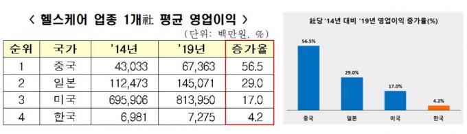 헬스케어 기업 1곳당 평균 영업이익률도 한국이 가장 낮았다.