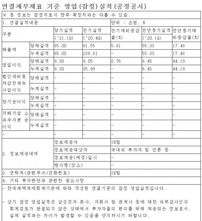 반도체, 공정 개선·美 공장 가동 중단 겹쳐 '기대 하회' 삼성전자가 올해 1분기 연결 기준 매출액 65조 원과 영업이익 9조3000억 원을 기록했다고 7일 공시했다.