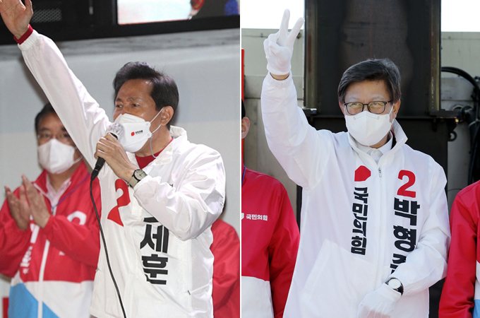 방송사 출구조사 결과에 따르면 서울시장 보선에서 국민의힘 오세훈 후보는 59.0%를 얻어 37.7%에 그친 더불어민주당 박영선 후보를 20% 포인트 이상 격차로 이긴 것으로 집계됐다.