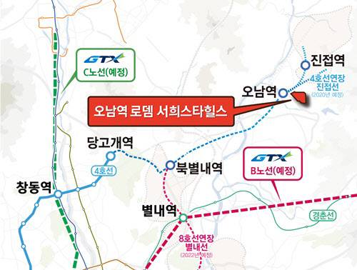 해당 사업지는 도보 5분 거리에 곧 개통을 앞둔 지하철 4호선 오남역(예정)이 위치한 역세권이 될 전망이다. 8호선 북별내선의 연장 개통이 예정된 가운데 예비타당성 조사를 통과한 GTX-B 노선과 진접선도 개통될 예정이다. 단지 300m 안에 양지초·오남중·오남고가 있다.
