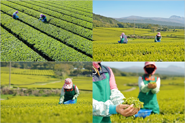 ▲ 제주 오설록 돌송이차밭에서 해차 새순 따는 모습. [아모레퍼시픽 제공]