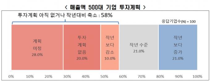 매출액 500대 기업 중 과반인 58.0%는 올해 투자계획이 없거나 투자를 축소할 것으로 조사됐다. 구체적으로 보면 △투자계획 미정 28.0% △투자계획 없음 20.0% △작년보다 투자 감소 10.0%이다.