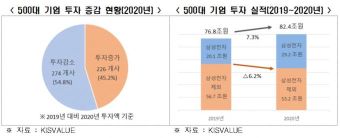 작년 한해 500대 기업 총 투자액은 82조4000억 원으로 전년도인 2019년 대비 7.3% 증가했지만, 삼성전자를 제외한 499개사의 지난해 투자 규모는 같은 기간 오히려 6.2% 감소했다.