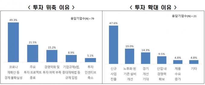 기업들은 올해 투자를 늘리지 않는 이유로 △코로나19 재확산 등 경제 불확실성 49.3% △주요 프로젝트 종료 21.5% △경영 악화로 인한 투자여력 부족 15.2%을 꼽았다. 기업 관련 규제 입법 또는 투자 인센티브 축소 등 제도적 이유로 투자를 늘리지 않겠다는 응답 역시 14.0%에 달했다.