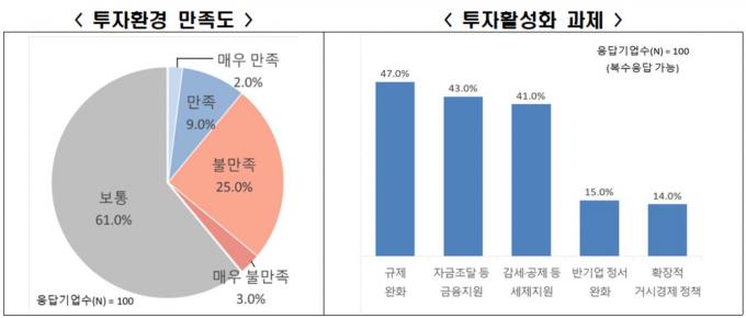 국내 투자환경 만족도는 100점 만점에 45.5점에 그쳐 기업들은 대체로 국내 투자환경을 부정적으로 평가하는 것으로 나타났다.