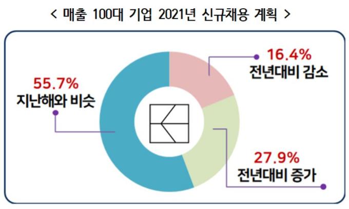 11일 한국경영자총협회가 '매출 100대 기업 신규채용 계획 조사'를 실시한 결과, '지난해와 비슷하다'는 응답은 55.7%, '전년 대비 증가' 27.9%, '전년 대비 감소' 16.4%로 각각 집계됐다.