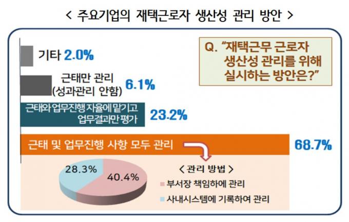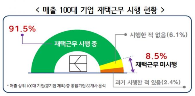 경총은 또 매출 100대 기업의 재택근무 현황을 파악했는데, 응답 기업의 91.5%가 현재 재택근무를 시행 중(이하 사무직 기준)인 것으로 나타났다.
