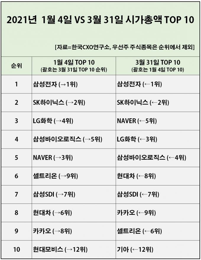 이와 달리 10곳 중 4곳은 시총 순위가 뒷걸음쳤다. 이중 현대모비스는 올 초 시총 순위 10위에서 3월 말에는 12위로 톱10 클럽에서 아예 빠졌다. 시총 금액은 3988억 원 증가했지만 시총 톱10을 지켜내지는 못했다. LG화학(3위→4위), 삼성바이오로직스(4위→5위), 셀트리온(6위→9위)도 시총 순위가 내려앉았다. 반면 기아는 올 초 12위에서 3월 말 10위로 톱10 멤버가 됐다. 현대차도 8위에서 6위로 순위가 앞당겨졌고, 카카오는 9위에서 8위로 일보 전진했다.