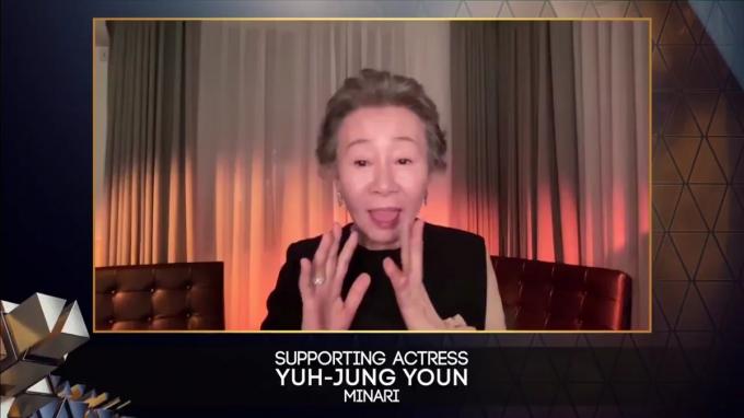 수상 후 윤여정은 화상을 통해 소감을 전했다. 그는 "나는 한국배우 윤여정이다"라고 소개한 후 "뭐라고 말해야 할지 모르겠다. 후보에 올라 매우 영광이다. 아니, 이제 후보가 아니고 수상자다"라고 말했다. 이어 10일 별세한 엘리자베스 2세 영국 여왕의 남편 필립공(에딘버러 공작)의 사망에 애도를 표했다.