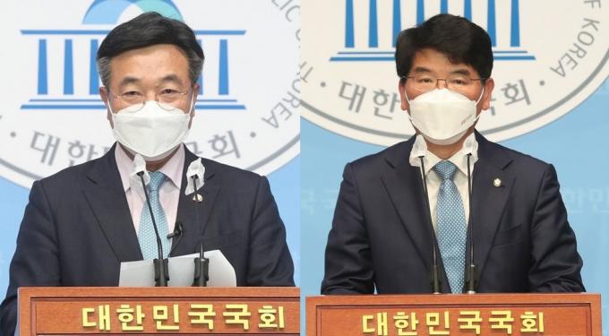 ▲12일 더불어민주당 차기 원내대표 경선 출마를 선언한 윤호중 의원(왼쪽 사진)과 박완주 의원. [뉴시스] 경기 구리시가 지역구인 4선의 윤 의원은 12일 후보 등록을 마친 뒤 기자회견을 열고 "재보궐 선거에서 국민의 준엄한 회초리를 맞았다"며 "이제 반성과 개혁의 시간"이라고 밝혔다.