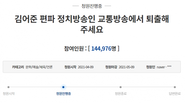 지난 9일 청와대 국민청원 게시판에는 '김어준 편파 정치방송인 교통방송에서 퇴출해주세요'라는 제목의 청원이 올라왔다.