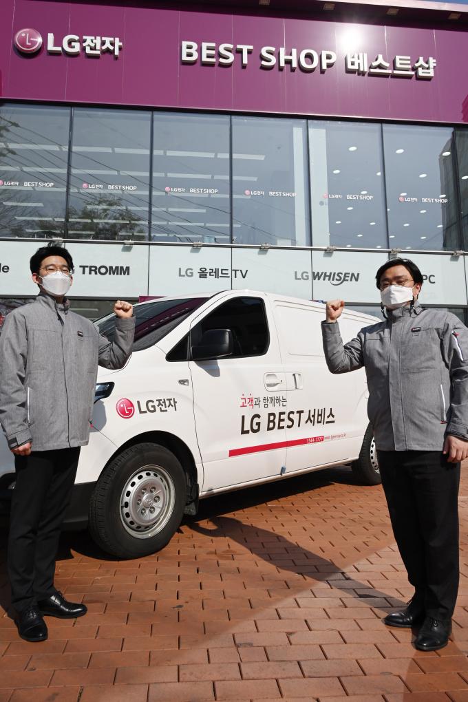 ▲ LG전자는 두 명의 엔지니어가 팀을 이룬 2인 전담 서비스를 확대·운영하며 고객에게 보다 빠른 서비스를 제공하고 있다. 서비스 엔지니어들이 2인 전담 서비스를 위한 차량 앞에서 포즈를 취하고 있다. [LG전자 제공]