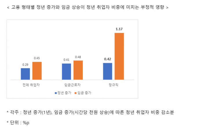 기존 근로자의 정년 연장과 평균임금 상승도 청년 취업에 악영향을 미치는 것으로 나타났다.