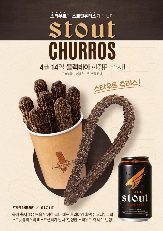 하이트진로는 츄러스 전문 매장 스트릿츄러스와 함께 신메뉴 '스타우트 츄러스'를 개발해 14일 한정 메뉴로 선보인다. 블랙데이 이벤트 메뉴로 선보이는 스타우트 츄러스는 스타우트 브랜드 특징을 고려해 진한 흑빛을 기존 오리지널 츄러스에 입혀 스트릿츄러스 이태원 1호 본점에서 판매할 예정이다.
