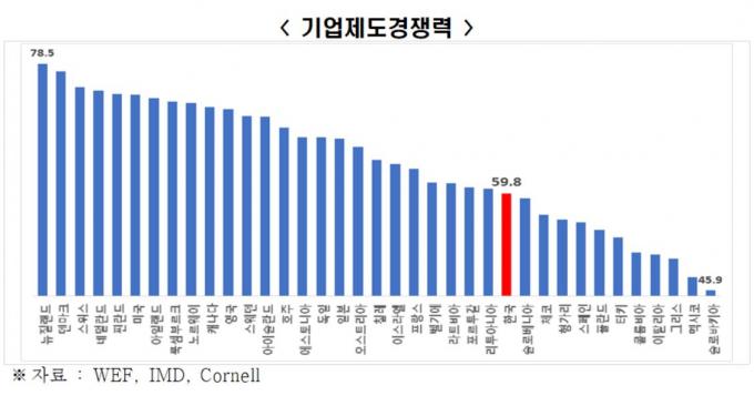 한국의 국가경쟁력 종합순위가 WEF 기준 OECD 국가 중 10위(2019년), IMD 기준 17위(2020년), Cornell 기준 9위(2020년)로 중상위권을 기록한 것과 비교하면 기업제도 경쟁력 순위는 많이 뒤지는 셈이다.