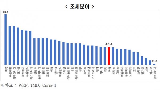 조세 분야는 GDP 대비 법인세 비중, 최고 법인세율, GDP 대비 정부지원금 비중 등 5개 세부항목을 종합·평가했는데, 우리나라 조세분야 경쟁력은 OECD 26위로 하위권을 기록했다. 이는 터키, 프랑스 등과 유사한 수준이다.
