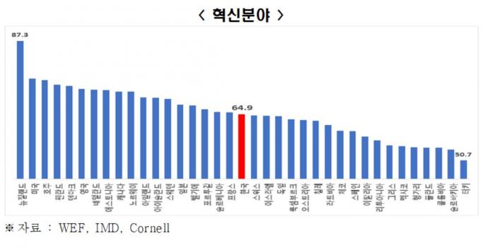 혁신 분야는 창업비용, 창업절차, 지적재산권 보호 등 12개 세부항목을 분석한 결과 19위로 타 분야 대비 높은 순위를 차지했다. 창업절차 3위, 창업 준비기간 8위 등으로 행정절차에서는 강점을 보였으나 창업비용(36위), 지적재산권 보호(29위), 창업지원 법제(27위) 등은 미흡한 것으로 나타났다.