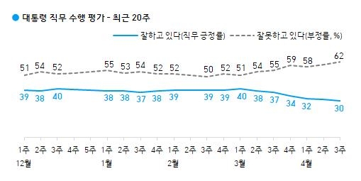 부정평가(62%)도 취임 후 최고치를 경신했다. 격차가 벌어지는 게 위기의 조짐이다.