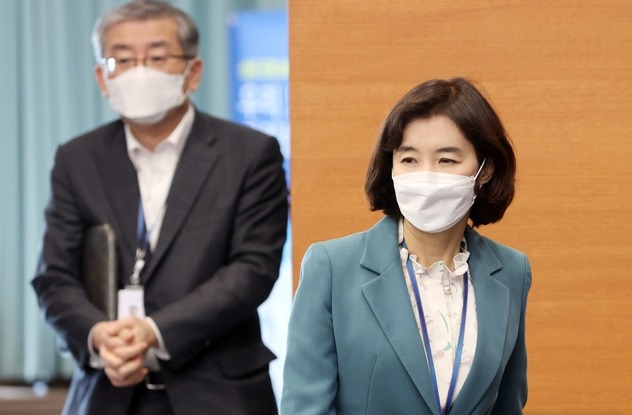 ▲청와대 박경미 교육비서관(오른쪽)이 지난 2월 22일 열린 수석·보좌관 회의에 참석하고 있다. [뉴시스]