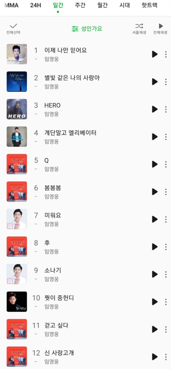 임영웅, 멜론 성인가요 일간차트 1~13위 독식