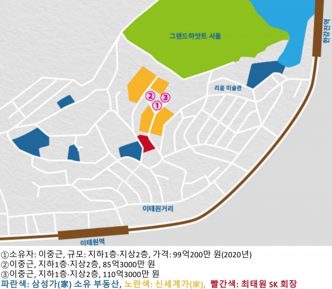 빨간 벽돌집 한남동 73X-XX번지(아래 [그림] 속 ①) 주인은 이중근 부영 회장이다. 1941년생인 그는 공교롭게도 회장에 취임한 해인 1994년 5월 면적 765.3㎡(231평)인 이곳 부지를 매입했다. 매입가는 확인되지 않았다. 지상 2층, 지하 1층에 연면적 438.15㎡(132평)인 빨간 벽돌집은 1994년 12월 말 완공됐다. 건물 등기부등본에 따르면 이 회장은 1995년 1월 중순 서울 강서구 화곡동에서 이 집으로 이사했다. 부영 법인등기부등본에도 이 회장이 대표이사에서 퇴임한 지난해 9월까지 이 집이 주소지로 돼 있다. 회장에 오른 직후 마련한 한남동 자택에 25년 넘게 거주한 셈이다.