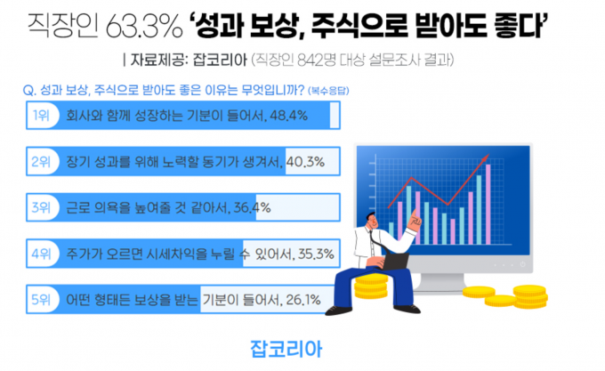 22일 잡코리아가 직장인 842명을 대상으로 성과급 주식 보상 관련 조사를 진행한 결과 직장인 63.3%가 '성과 보상 주식으로 받아도 좋다'라고 답했다.