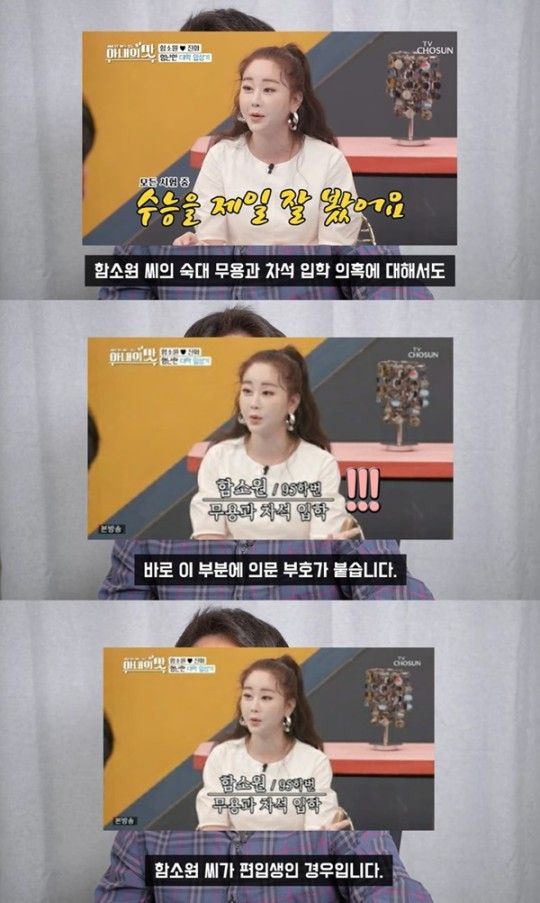 그러나 이진호는 95년 차석 입학에 대한 확인이 필요하다고 언급했다. 그는 "함소원은 숙대 무용과 95학번이다. 함소원은 tvN '택시'에 출연해 '1997년 미스 태평양으로 선발됐다. 그때 제가 숙대 무용과 1학년 재학 중이었다. 숙대 무용과에 들어가서 도전했다'고 했다"라고 언급했다.