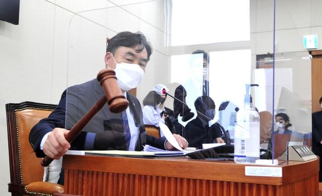 ▲더불어민주당 소속 윤관석 국회 정무위원장이 22일 정무위 전체회의를 개의하고 있다. [뉴시스]