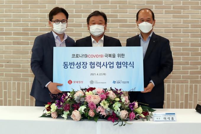 ▲ (왼쪽부터) 롯데칠성음료 박윤기 대표, 전국종합주류도매업중앙회 이석홍 회장, IBK기업은행 박주용 부행장 [롯데칠성음료 제공]
