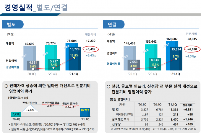 포스코의 올해 1분기 연결기준 영업이익은 2011년 2분기(1조7000억 원) 이후 약 10년 만에 최대치다. 회사 관계자는 "철강, 글로벌 인프라, 신성장 등 전 부문에서 고르게 실적이 개선된 덕분에 호실적을 냈다"고 설명했다.