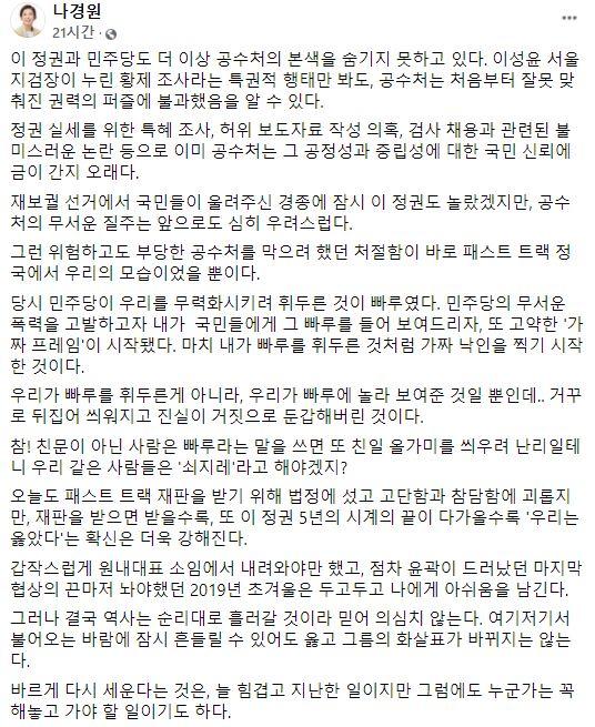그는 "이 정권과 민주당도 더 이상 고위공직자범죄수사처(공수처)의 본색을 숨기지 못하고 있다"며 "공수처를 막으려 했던 처절함이 바로 패스트트랙 정국에서 우리의 모습이었을 뿐"이라고 회고했다.