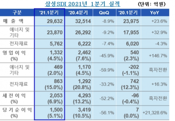 삼성SDI는 2021년 1분기 연결기준 매출 2조9632억 원, 영업이익 1332억 원을 거둔 것으로 잠정집계됐다고 27일 밝혔다. 전년동기보다 매출은 23.6% 늘고 영업이익은 146.7% 증가한 결과다.