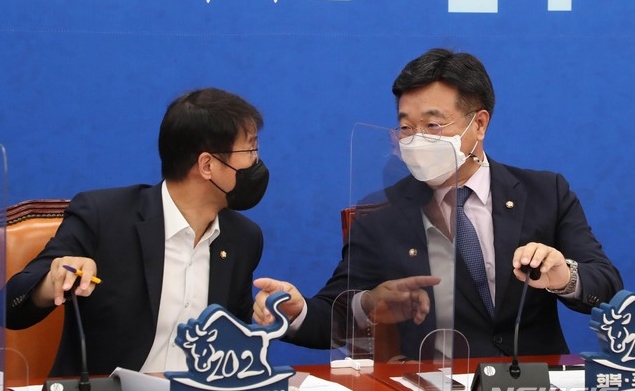 ▲더불어민주당 윤호중 비대위원장(오른쪽)과 한병도 원내수석부대표가 27일 오전 서울 여의도 국회에서 열린 원내대책회의에서 마이크를 가리고 대화하고 있다. [뉴시스] 최 수석대변인은 지난 26일 종부세 완화 주장에 대해 "부동산 세금 관련 논의는 당분간 없다는 것을 확실히 말씀드린다"고 못박았다.
