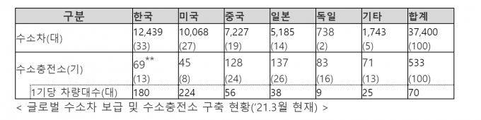 한국자동차산업협회(KAMA)는 28일 3월 말 기준 전 세계 수소차 중 33%가 한국에서 운행 중이며, 보급률로 치면 한국이 세계 1위라고 밝혔다. 그러나 충전기 1기당 차량대수는 180대로 나타나 1기당 224대의 미국에 이어 두 번째로 충전인프라가 미흡한 것으로 나타났다.