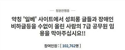 이에 그가 과거 일베에서 장애인을 비하하고, 미성년자와 성관계했다며 사진을 올리는 등의 일을 했다며 그의 7급 공무원 임용을 막아야 한다는 국민 청원이 올라왔다. 해당 청원에는 10만 명이 넘게 동참했다.