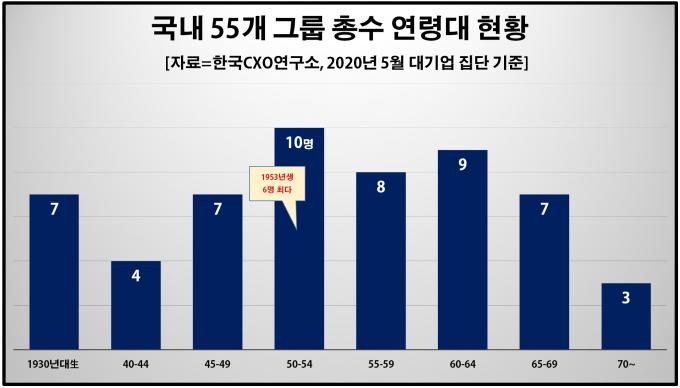 조사 대상 55명 총수의 평균 연령은 67.9세로 파악됐다. 이 중 60대가 21명으로 가장 많았고, 70대(13명), 50대(10명), 80대(9명) 순으로 많았다. 조원태(47세) 한진 회장과 구광모(44세) LG 회장 두 명은 40대 젊은 총수에 속했다.