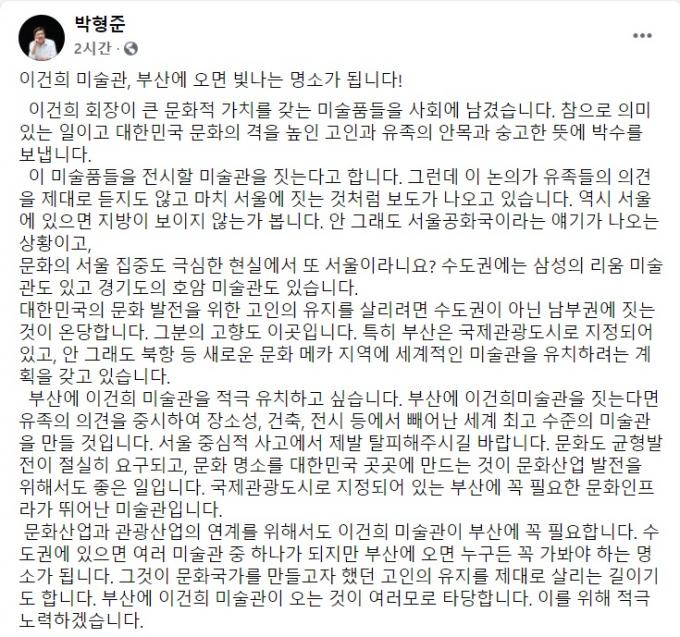 그러면서 "수도권에 있으면 여러 미술관 중 하나가 되지만 부산에 오면 누구든 꼭 가봐야 하는 명소가 된다"며 "그것이 문화국가를 만들고자 했던 고인의 유지를 제대로 살리는 길이기도 하다. 부산에 이건희 미술관이 오는 것이 여러모로 타당하며, 이를 위해 적극 노력하겠다"고 글을 맺었다.