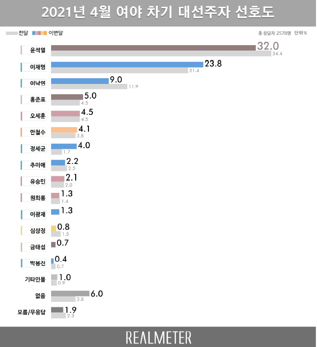 리얼미터가 3일 발표한 여론조사(오마이뉴스 의뢰로 지난달 26~30일 만 18세 이상 2578명을 대상으로 실시) 결과, 윤 전 총장 지지율은 32%로 나타났다. 전월대비 2.4%포인트(p) 하락했다.