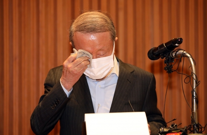 ▲ 홍원식 남양유업 회장이 최근 자사 유제품 불가리스가 코로나19 억제 효과가 있다는 발표로 빚어진 논란과 관련해 4일 오전 서울 강남구 도산대로 남양유업 본사 대강당에서 대국민 사과를 발표하며 눈물 흘리고 있다. [문재원 기자]