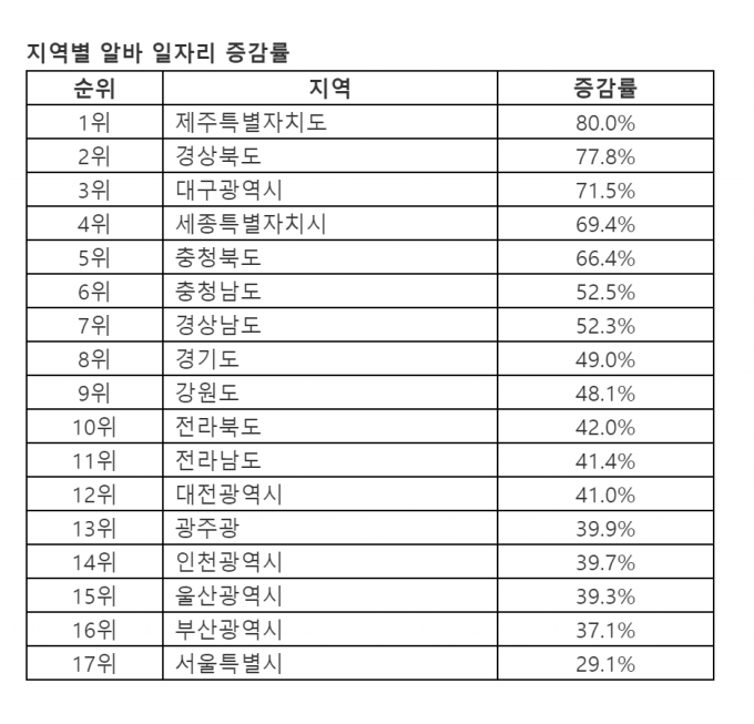 전국에서 알바 공고수 증가율이 가장 낮은 지역은 △서울특별시였다. 제주특별자치도가 80% 증가한 것에 반해 서울시의 알바 공고수 증가율은 29.1%에 그쳤다.