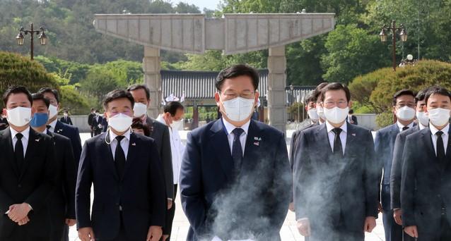 민주당 송영길 대표는 이날 오전 윤호중 원내대표 등과 함께 광주에서 국립5·18민주묘지를 참배했다.