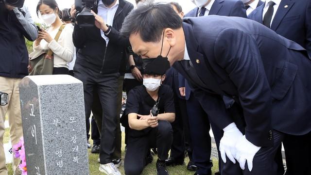 ▲국민의힘 김기현 당대표 권한대행 겸 원내대표가 7일 오전 광주 북구 운정동 국립5·18민주묘지 행불자묘역 묘비를 살펴보고 있다. [뉴시스]