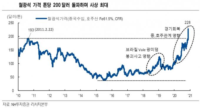 11일 철강업계에 따르면 중국에서 수입하는 호주산 철광석 가격이 지난 10일 톤(t)당 228달러로 하루 새 8.7% 급등, 사상 최고가를 기록했다. 철광석 가격은 올해 들어서만 44.0% 상승했고 한 달 만에 33.5%나 올랐다.