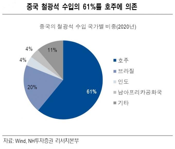 최근 중국은 호주와의 '전략 경제 대화' 중단을 선언했다. 중국과 호주의 마찰이 장기화할 것이란 우려가 커지고 있다. 중국은 필요한 철광석의 약 80%를 수입하는데 수입 철광석의 61%를 호주에 의존하고 있다.