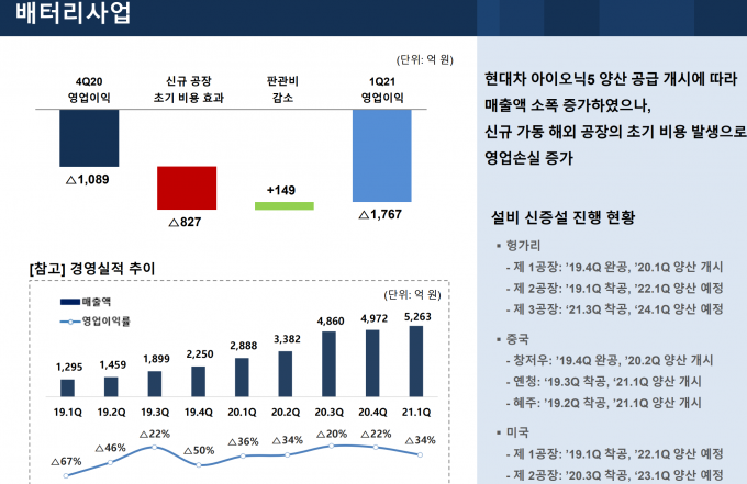 배터리 사업 영업손실은 해외 공장의 초기 비용 증가 영향으로 전분기 대비 약 678억 원 늘어난 1767억 원을 기록했다.