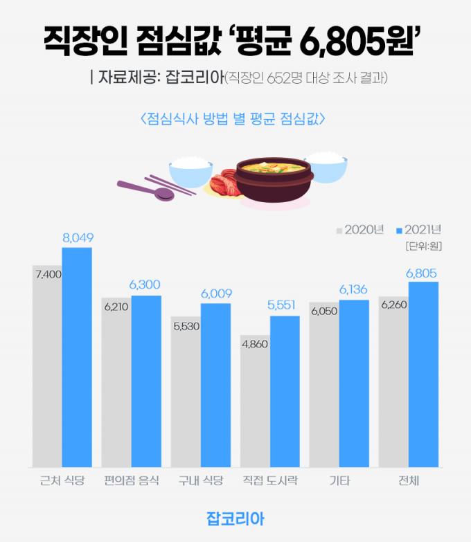 취업 플랫폼 잡코리아가 직장인 652명을 대상으로 '점심값 현황'에 대해 조사한 결과, 올해 직장인들은 점심값으로 평균 6805원을 사용하고 있었다. 이는 회사 근처 식당에서 점심을 사 먹는 직장인부터 구내 식당을 이용하거나 도시락을 싸 오는 직장인들까지 포함한 평균치로, 지난해 동일 조사결과(2020년 평균 점심값 6260원) 대비 8.7% 증가한 수치다.