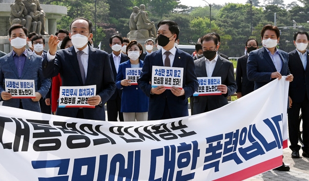 국민의힘은 거센 항의의 뜻을 표하기 위해 이날 청와대 앞에서 긴급 의원총회를 열었다.