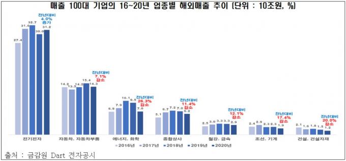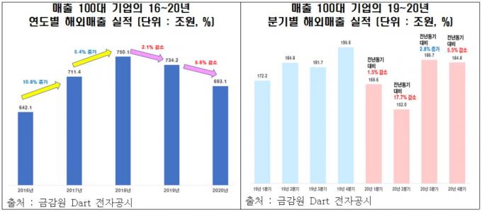 전국경제인연합회는 2019년 기준 매출 100대 기업의 2016~2020년 연결기준 실적 데이터를 분석한 결과, 해외 매출이 2019년 미국과 중국 간 무역 분쟁과 지난해 코로나19 발(發) 글로벌 경제 위기로 인해 2년 연속 마이너스(-) 성장했다고 17일 밝혔다.