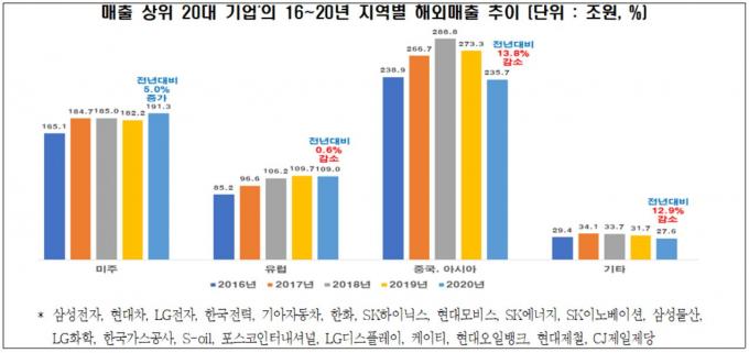 또 지역·국가별 해외매출을 발표하는 매출 상위 20대 기업의 지역별 실적을 분석한 결과, 지난해 중국·아시아 지역을 대상으로 한 해외 매출이 전년 대비 13.8% 감소해 가장 큰 폭으로 줄어든 것으로 나타났다.